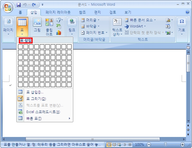 1. 삽입 탭의 표 그룹에서 표 클릭